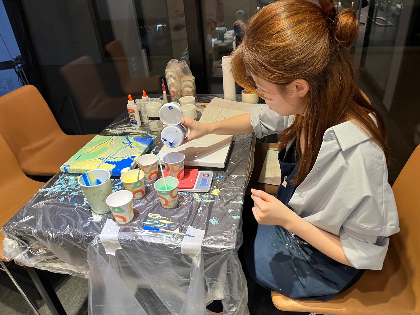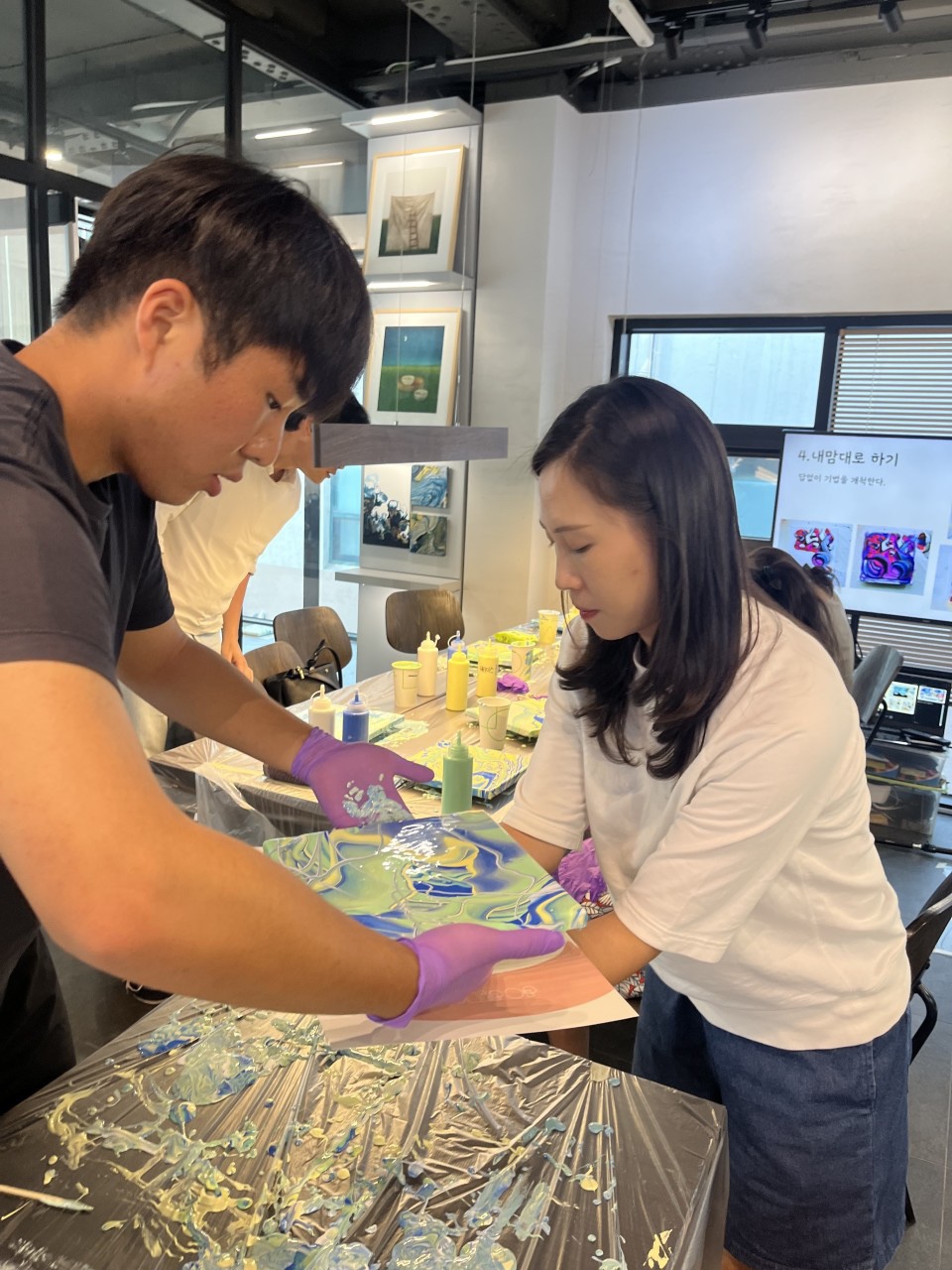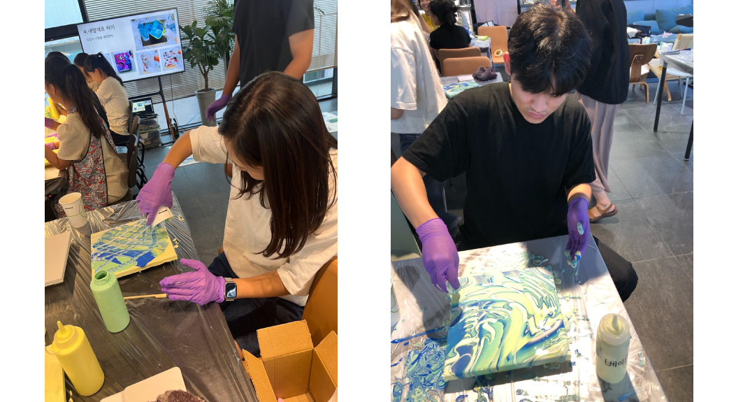 플루이드는 물감과 보조제를 섞어 캔버스 위에 부어서 표현하는 방법이에요.
